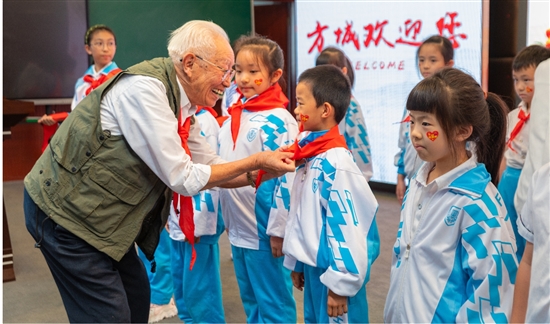 最激动人心的环节是老队员为新队员佩戴人生的第一条红领巾。现场,学校还邀请了全国少先队优秀辅导员俞明德为少先队员代表佩戴红领巾。戴上红领巾的那一刻,每一张稚嫩的脸上都洋溢着自豪的喜悦,展露着坚毅的信心。