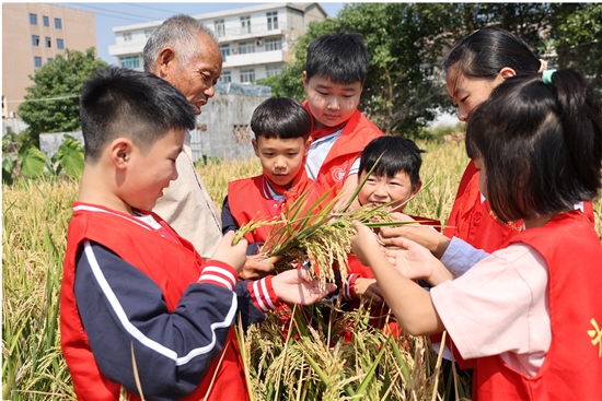 眼下正是稻黄秋收时。近日,松门镇第三小学把课堂搬到田野,让学生走进淋头村一农田,听农民伯伯讲粮食的种植过程,通过教育和实践,让学生了解农民种植粮食的艰辛,更加懂得爱惜、节约粮食。