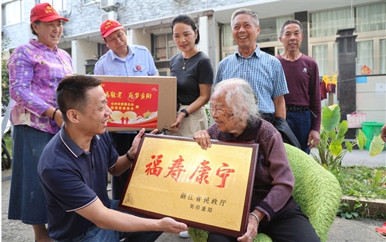 10月19日,太平街道工作人员为辖区内的10位百岁老人送上长寿牌匾、重阳节大礼包和节日慰问金,以此来弘扬中华民族尊老、敬老、爱老的优良传统。 通讯员 张鲜红摄