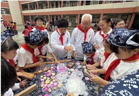学生和“五老”一同制作重阳糕。