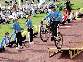 有的班级进行了山地自行车比赛;有的班级讲解了航天史……其中,七(5)班精心准备的节目“山地自行车表演”尤其引人注目。现场,一辆辆山地车呼啸冲上斜坡,骑手在空中或展开双臂,或抬高车头,潇洒极了。
