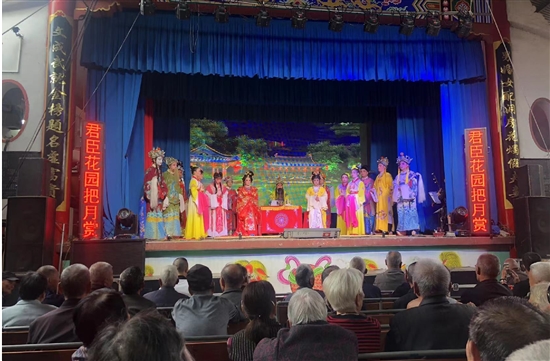 记者这一回到新河城隍庙时,去得迟了一点,只有一张供桌上还有鸡、鸭、猪头等福礼未撤下。12时不到,戏台前,已有十几位看戏的阿公阿婆在前面的座位上坐等13时后开始的安徽百花黄梅艺术团的黄梅戏演出了。