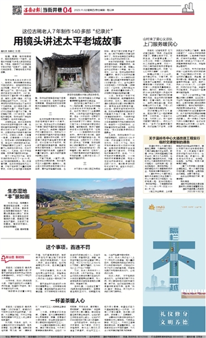 从此,陈定华一发而不可收,只要有时间,就带着摄像机到处转悠。石夫人、藤岭古道等温岭名胜古迹也都以讲故事的形式,展现在他的视频短片里。2020年,肖泉村启动城中村改造,陈定华带着摄像机把肖泉旧村里里外外拍了个遍,制作了《拆建前的肖泉村》,为肖泉村留下了珍贵的拆前资料。这两年,太平街道轰轰烈烈地开展城村两改,每启动一个区块的拆迁,必定能看到陈定华的身影。他开玩笑说:“老太平的影像素材我这里最全。”
