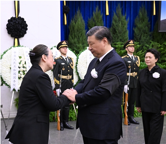 11月2日,李克强同志遗体在北京八宝山革命公墓火化。习近平、李强、赵乐际、王沪宁、蔡奇、丁薛祥、李希、韩正等前往八宝山送别,胡锦涛送花圈表示哀悼。这是习近平与李克强亲属握手,表示深切慰问。 新华社记者 谢环驰摄