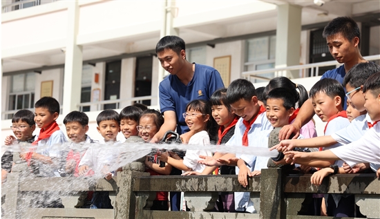 此次,专职消防队共出动了3辆消防车,现场演示高空喷水灭火、低空远程输水灭火等科目。看着消防水带快速接管并“喷水”,学生们兴奋不已。随后,消防员来到学校前门操场的跨桥上,让大家体验消防水带和消防枪,并对具体用法和放水要点进行讲解。