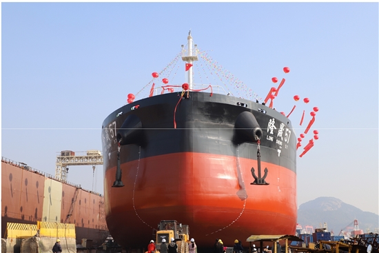 浙江合兴船业有限公司坐落在松门镇松北村,占地面积600多亩,建有大型船台9座,其中35000~68000吨级船台6座,15000~35000吨级船台3座,年造船能力45万载重吨。当天上午顺利上水的“隆晟57”号散货船,结构吃水为53500吨,于2022年11月1日开造,设计为航行于国内近海航区和长江下游地区各港口的散货船。“这条船的船东是我们的老客户,从2017年开始就和我们合作,能够顺利完成建造任务,我们也非常激动。”浙江合兴船业有限公司相关负责人介绍道。