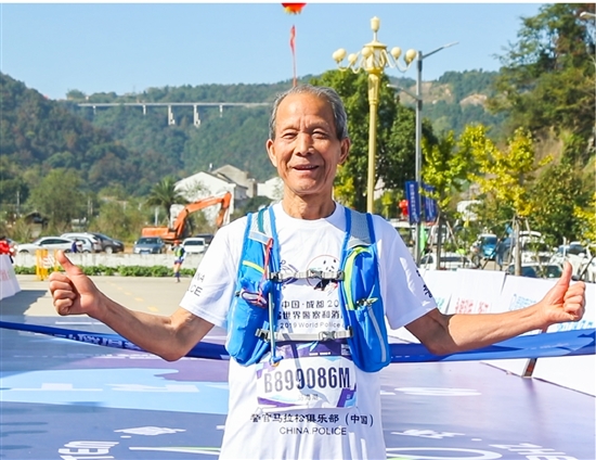 在众多的选手中,一位白发苍苍的老警察特别引人注目。79岁的马海潮来自新疆,退休前是新疆奎屯市看守所民警,是此次警察越野邀请赛参赛年龄最大的选手。为了参加比赛,11月17日,他从新疆坐火车到达南京,又辗转来到温岭。他告诉记者,在他65岁那年,妻子因病去世,他带着对妻子的思念,开启了为爱奔跑的道路。14年来,他参加过30多次马拉松比赛,赛程累计达8万多公里,足迹遍布全国10多个省市。他说:“跑步的时候,我可以忘却悲伤,在奔跑中感受健康快乐。到85岁的时候,我想跑完12万公里,绕地球三圈。”