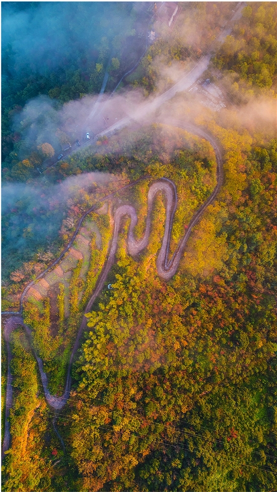 11月23日,初冬时节,天气晴朗,藤岭雾气缭绕,树叶已经变黄,如诗如画。起雾一般出现在季节交替时期,在大温差和大量的水汽环境条件下形成。