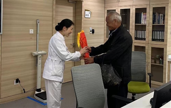 大约半个小时后,医务人员纷纷前来上班。当阿公看到护士蒋赛赛,便高兴地走上前,将手中的红卷交到她手上:“蒋护士,谢谢你!”原来这红卷是一面锦旗。蒋赛赛接过锦旗后,激动地说:“阿公你太有心了,这是我作为一名护士应该做的。”