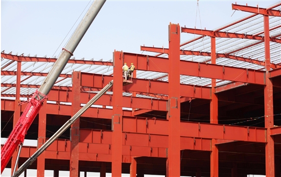 11月27日,东部新区南区,建筑工人在建设鑫磊压缩机股份有限公司智能制造未来工厂钢结构厂房。