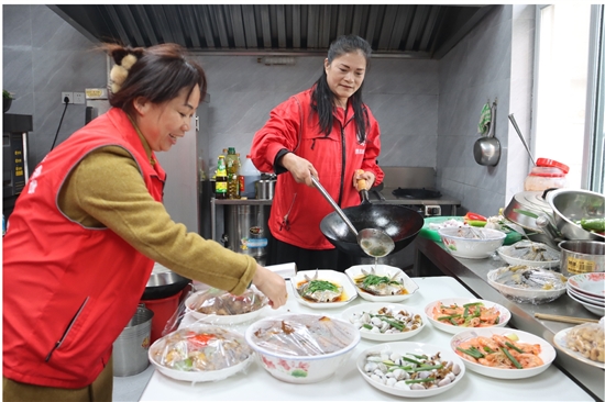 中午11时,随着香喷喷的红烧肉、鲜美的鲳鱼、当地特色手工糕陆续上桌,大家有说有笑,现场一片其乐融融的温馨画面。