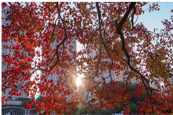 眼下,我市各地公园里、人行道上的乌桕树进入最佳观赏期,一树树红叶犹如燃烧的火焰,为深秋增添了亮丽的色彩。