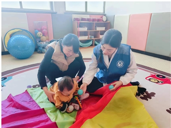11月30日,省级文明单位温岭市妇幼保健院组织志愿者为儿童保健科候诊家长和小月龄宝宝开展感统训练,指导专业、实用的家庭感统训练技巧,并传授常见传染病预防知识。