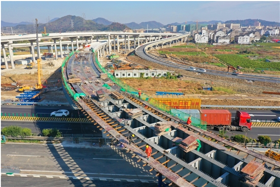 12月6日,甬台温高速至沿海高速温岭联络线大溪枢纽处,建设者正在大溪互通拓宽段钢厢梁上施工。随着跨甬台温高速段钢厢梁的成功架设,“两高”联络线将实现全线贯通,为春节前通车打通最后一个卡点。“两高”联络线通车后,不仅在温岭境内将甬台温高速和沿海高速连接成网,还将与台金高速形成台州环城高速,促进区域交通一体化,带动沿海产业带发展。