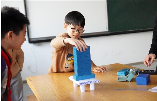 一张平平无奇的A4纸,能创造出多少种可能?学生们发挥奇思妙想,通过自己灵巧的小手,给出了多彩的答案:他们用不同的方式,小心翼翼地将A4纸撕成长条状而不断裂;大家各显神通,看看谁的纸环滚得最远;经过各种折叠,大大小小的纸蛙在地上蹦来蹦去,激烈地开展“纸蛙跳得远”活动;学生们用A4纸制作成五角星、圆形、圆柱体等各式各样的陀螺,开展“纸陀螺转得欢”活动;“纸桥载得多”活动中,学生们用A4纸制作的轻巧桥梁,承载着大能量……
