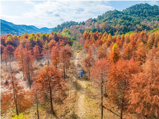 近日,位于大溪镇的落羽杉林迎来一年之中最美的时节。从空中俯瞰,杉树林红黄相间,层林尽染,宛如大自然的调色板,充满了诗情画意。