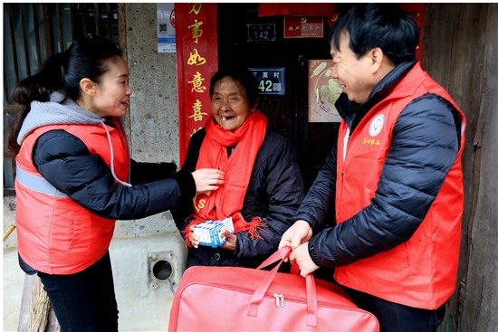 昨天,新河镇曙光义工协会志愿者联合党员帮帮团,带着棉被、围巾等御寒物资,看望当地空巢、孤寡老人,让他们感受到社会的温暖和关爱。 通讯员 林绍禹摄
