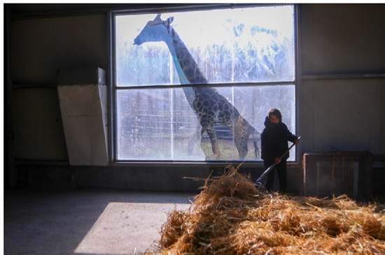 随着寒潮来袭,近日,温岭动物园为长颈鹿开启防寒保暖模式。饲养员在地面铺了厚厚的干稻草,并打开了室内的保暖器,确保长颈鹿能够安然过冬。
