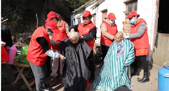 本报讯(通讯员江文辉文/图)“阿婆,今天天气比较暖和,我们来给你理发了,来,我扶你坐下。”近日,松门镇神祉塘边的梨山头老人集中居住区来了一群身穿红马甲的年轻人,他们分头到老人家里提供志愿服务。他们就是来自温岭市益善好人志愿者服务中心的志愿者。