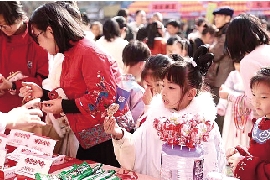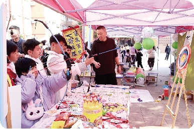 锣鼓声阵阵,花瓣彩带礼炮齐放,舞狮活动拉开了街市义卖的序幕!伴随着太平小学校长徐海融的一句“开市喽”,太平小学的学生们“穿越”千年,来到了繁华的街市。这里有凭借才华兑换钱币的“仁义钱庄”,有颜如意书局,有翰林笔坊,也有诱人可口的美食、精致亮眼的工艺品,更有投壶、套圈等各种游玩项目,大家流连其间,快乐不已。