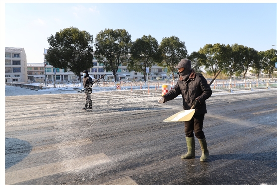 除了公路养护人员,松门镇还发动了环卫工人对负责的路段进行积雪处理。当天,松门镇共出动22人、8辆车,调运日晒盐10吨,对14条主干道采取了撒盐促溶措施。