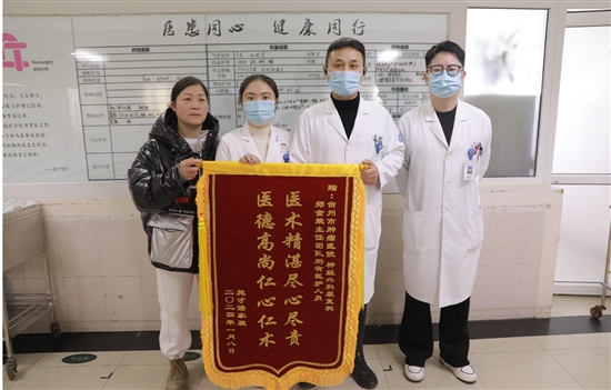 患者家属向康复科主任郑金荣(左三)及团队送上锦旗。(照片由采访对象提供)