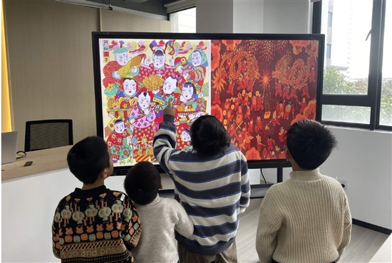 “妈妈,这些五颜六色的年画真好看!”“我想看那幅画着龙的。”“快过来,这里还可以写春联!”……在宗文社区文化家园内,孩子们稚嫩又欢快的声音此起彼伏。现场通过电子屏幕展示了一张张色彩鲜艳、风格独特的年画,为活动增添了浓浓的年味,吸引了不少居民带着小朋友前来欣赏。“这些年画,在我们那个年代都是‘一张难求’,今天能在社区里看到,觉得又熟悉又亲切,我们在家门口就感受到了浓浓的年味。”居民陈大姐带着孩子,一边观赏大屏幕上的年画作品一边高兴地说。