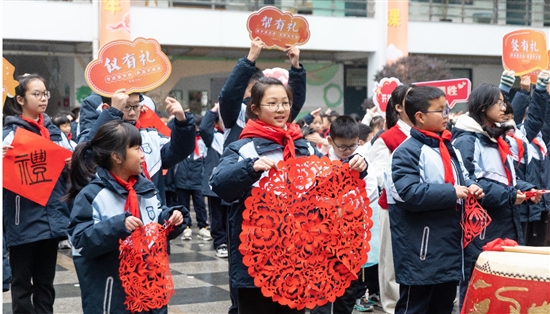当天上午8时30分,一场快闪活动在学校中厅拉开了开学第一课的帷幕。校长带领两名学生敲响了大鼓,四名学生率先唱响了《相约中国梦》,身穿汉服的小朋友们则展示了传统礼仪,学校书法社团书写了各种字体的“礼”字,剪纸社团剪出了各种“礼”字剪纸作品。最后,所有学生手举“浙风十礼”异形牌,围拢在中厅一起唱响《因为有礼》,在歌声中将开学第一课的活动推向高潮。