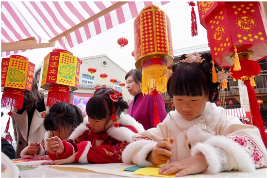 本报讯(通讯员莫超任文/图)投壶、套圈、猜灯谜、敲鱼面、印糖龟、逛非遗市集……近日,石塘镇东山村文化礼堂热闹非凡,充满了浓郁的节日氛围。为让群众感受传统节日蕴含的深厚文化底蕴,石塘镇党建办、妇联、团委联合举办“国潮来袭 我在礼堂过大年”活动之“春光为序 福启新岁”民俗活动。