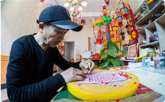 2月19日,石桥头镇上王村,温岭王氏大花灯制作技艺非遗传承人王妙顺正在制作花灯,为元宵节活动做准备。 记者 徐伟杰 通讯员 蒋友彬 摄