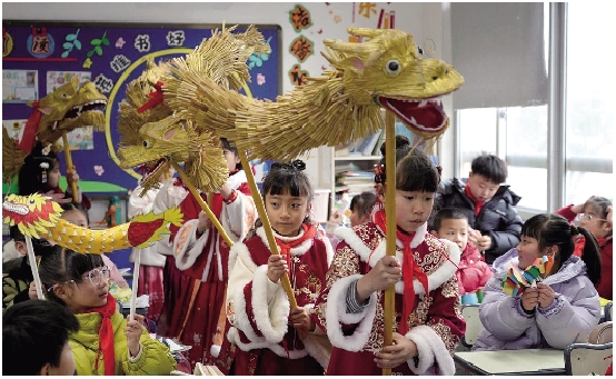 首日,城南非遗稻草“祥龙”伴随着喧腾的音乐,在城南小学“龙”重登场。金黄色的草龙在同学们的手中飞舞着,穿梭于每一间教室,以热烈而喜庆的方式,给大家送去新春的祝福。