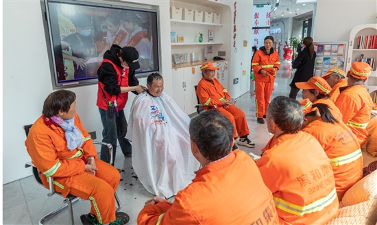 为传承和弘扬雷锋精神,营造全社会尊老、敬老、护老的氛围,3月5日,工商银行台州温岭支行在该行营业大厅开展爱心义剪活动,为十多位环卫工人提供免费理发服务。现场,志愿者们用精湛娴熟的手艺和热情周到的服务,让环卫工人切实感受到温暖与关怀。 记者 章毅 摄