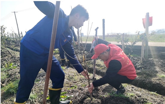 本报讯(记者江晓佳文/图)3月12日,我市朝阳志愿队爱心人士联合新河镇消防中队、新河派出所工作人员,为孤寡老人们种植一片“爱心果园”。