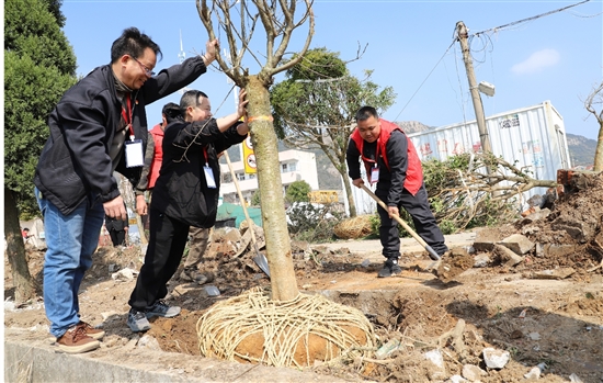 为助力松建村建设坦人谷农文旅项目,流动党员们在铲车的协助下,挥锹培土,种下多棵树杆直径在28厘米左右的樱花、紫藤等树种。 通讯员 江文辉 摄