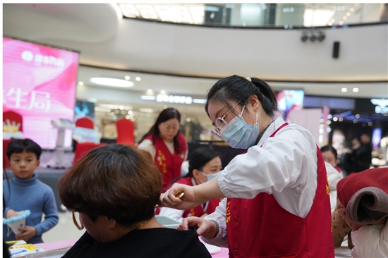 3月8日,市一院社工部组织多个科室在银泰百货开展义诊,闻讯而来的百姓很快排起了长队。图为中西医结合老年科的专科护士陈飘羽,用专业的疏通手法刺激特定穴位来促进身体代谢,帮助人体排出毒素。 通讯员 徐巧 摄