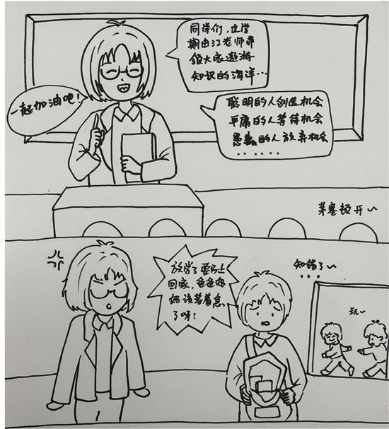 课堂上,江老师慢条斯理地带我们进入语文的世界,从“天地人”,到“aoe”,再到一首首诗歌,一篇篇文章。时常也有不懂事的小朋友会走神,会哭闹,而她总会轻轻抚摸小朋友的头,轻声鼓励着他们。下课后,她轻声细语地叮嘱:“要去上厕所的小朋友请抓紧,路上不能跑。口渴的小朋友,拿上杯子去灌水……”
