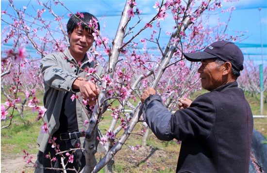 眼下,滨海镇至拙园家庭农场百亩桃林迎来盛花期,果农及时开展疏花,调节养分,以此提高果实品质,增加经济效益。