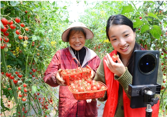 近日,在滨海镇金闸村“绿色之歌”家庭农场,青年党员江梦莎正在帮助农户“直播带货”,助销小番茄。