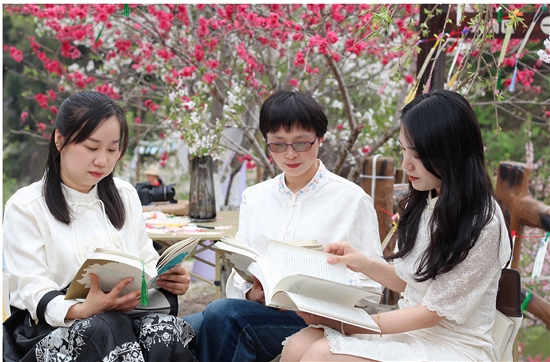老师们在樱花园品读书籍篇章。通讯员 鲍晓莹 摄