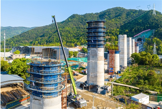 温玉铁路自杭台高铁温岭站引出,新建正线约37千米,概算总投资约76亿元,设计时速350千米。截至目前,温玉铁路温岭段已完成土建工程量的37%,完成全线桥梁段桩基施工2267根、承台208个、墩身182个,浇筑连续梁864米,隧道开挖进尺6981米。 记者 徐伟杰 摄