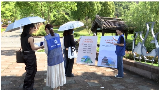 4月29日上午,在市区五龙山公园门口,市文广旅体局联合市创建办开展文明劝导活动,向游客发放文明出行宣传册,呼吁广大市民“五一”期间文明出游,拒绝不文明行为,营造和谐的出游环境。 记者 林奥翔 摄