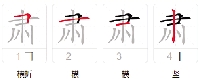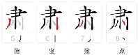 “肃”字在书写时需在三处特别注意:首先,第二笔是长横,一定要突破折笔通出去,这是表示手的“又”字中长长的手臂;其次,第五笔是竖撇,这是由“<\\10.102.26.44\xsbdata\pic\tp\2023年图片库\image0119.tif>”字演变而来的,应该指深渊一边的水岸,如果不写好,容易与第七笔的短撇雷同;最后,下半部分四笔的顺序是由外而内、从左到右(详见下图)。