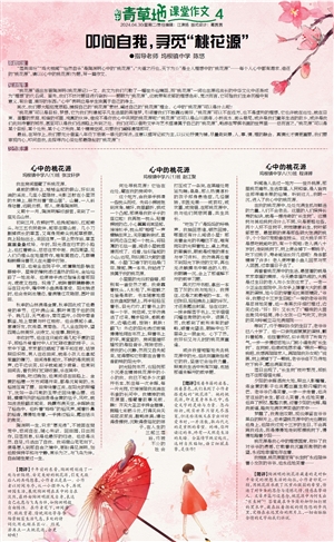 “桃花源”语出东晋陶渊明《桃花源记》一文。此文为我们勾勒了一幅世外仙境图,而“桃花源”一词也在源远流长的中华文化中逐渐成为“理想”的代名词。首先,我们不妨对题目进行剖析——题眼为“桃花源”,这就带有浓郁的理想色彩,宽泛而言,它可指我们生命历程中有意义、有价值、美好的东西;“心中”表明应是学生独属于自己的净土。
