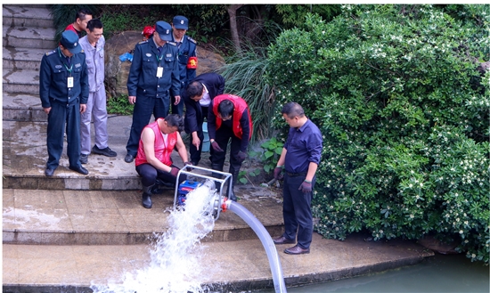 最先调试的新型排涝水泵是今年社区新采购的。“这种水泵很轻便,两个人就能轻松地抬着走,移动方便。”东湖社区相关负责人林君伟介绍。现场,关于新水泵如何使用、油从哪里加入、启动前需要注意哪些事项,林君伟一一向一起参与演练的人员作了详细介绍。