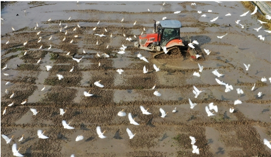 近日,在新河镇郑洋新村田头,“铁牛”翻耕、鹭鸟翩翩,构成一幅人与自然和谐共处的田园画卷。