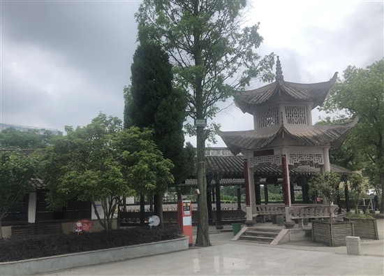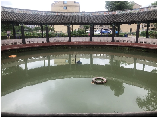 宗祠前面,还设有公共自行车站点。宗祠东南角有座名为“敬老亭”的石亭,石亭南边是村里的文化大舞台;石亭东北边上是一座圆池,四周建了回廊,可以坐在回廊下的凳子上休闲,池水看起来比较清澈。圆池北边有面屏风墙,中间大书了一个“孝”字。