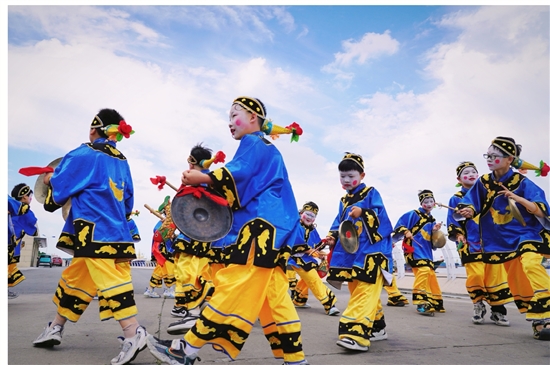 作为每年“六一”的压轴节目,学生们身着盛装,欢快地舞动着鼓棒,随着鼓点的节奏,翩翩起舞。通过跳大奏鼓舞,学生们在体验非遗魅力的同时,更好地传承渔家文化。