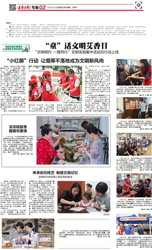 本报讯(通讯员江文辉 朱国兵童含笑文/图)“这里有烟蒂,快来捡。”“爷爷,请尽量别吸烟,如果吸了的话,也请别乱扔烟蒂哟!”5月30日,在箬横镇中心小学门口,一群身着红马甲的小小志愿者分成多个小组,边捡拾烟头边向过往群众分发垃圾分类宣传资料,并建议大家少吸烟、不吸烟,不乱扔垃圾,以实际行动参与“指尖文明”。他们就是学校的“小红萌”学生志愿者。“在每一次节俗文化活动中,这支志愿队都会行动起来,通过‘小手牵大手’的方式开展活动,为文明城市创建贡献少年儿童力量。”箬横镇中心小学老师江于祥介绍道。