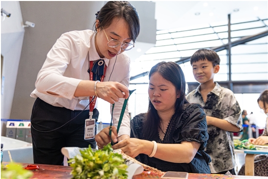 6月10日端午节当天,市民们在市博物馆参加艾草花束制作活动,在工作人员的指导下将艾草和菖蒲进行巧妙编织,加入香囊、竹编篮等装饰物,制作成一束束既彰显传统风俗又融入潮流时尚的艾草花束。