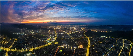 6月15日,航拍镜头下的温岭市区暮色渐沉,落日的余晖渲染出瑰丽的光芒,灼烧在深蓝色的天幕上。华灯初上,霞光散落,城市夜景绚丽如画。 记者 徐伟杰 摄